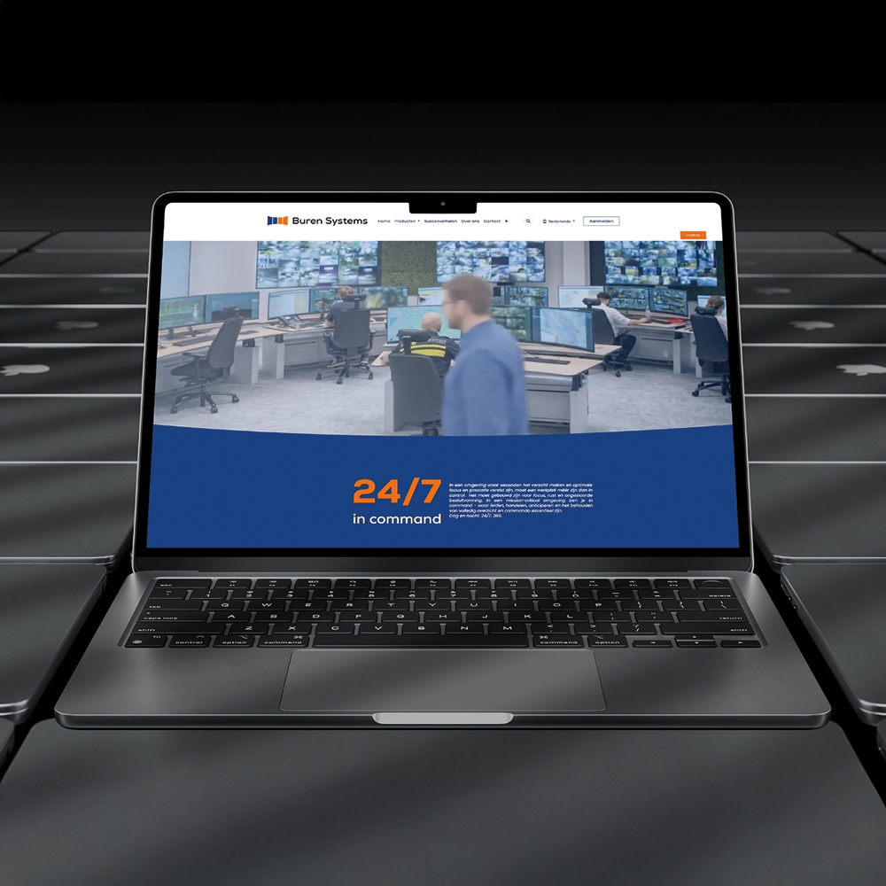 Totdat Sem met een alternatief kwam. Hij baseerde het nieuwe logo op de bestaande variant, maar gaf er een eigentijdse draai aan. In plaats van één vierkant toont het logo nu vier schermen, iets waar vrijwel iedere werkplek en control room van Buren Systems om bekend staat. Aangezien we toch bezig waren, maakten we ook de kleuren van zowel het logo als de gehele huisstijl sprekender. Het doffe eruit, het knallende erin.